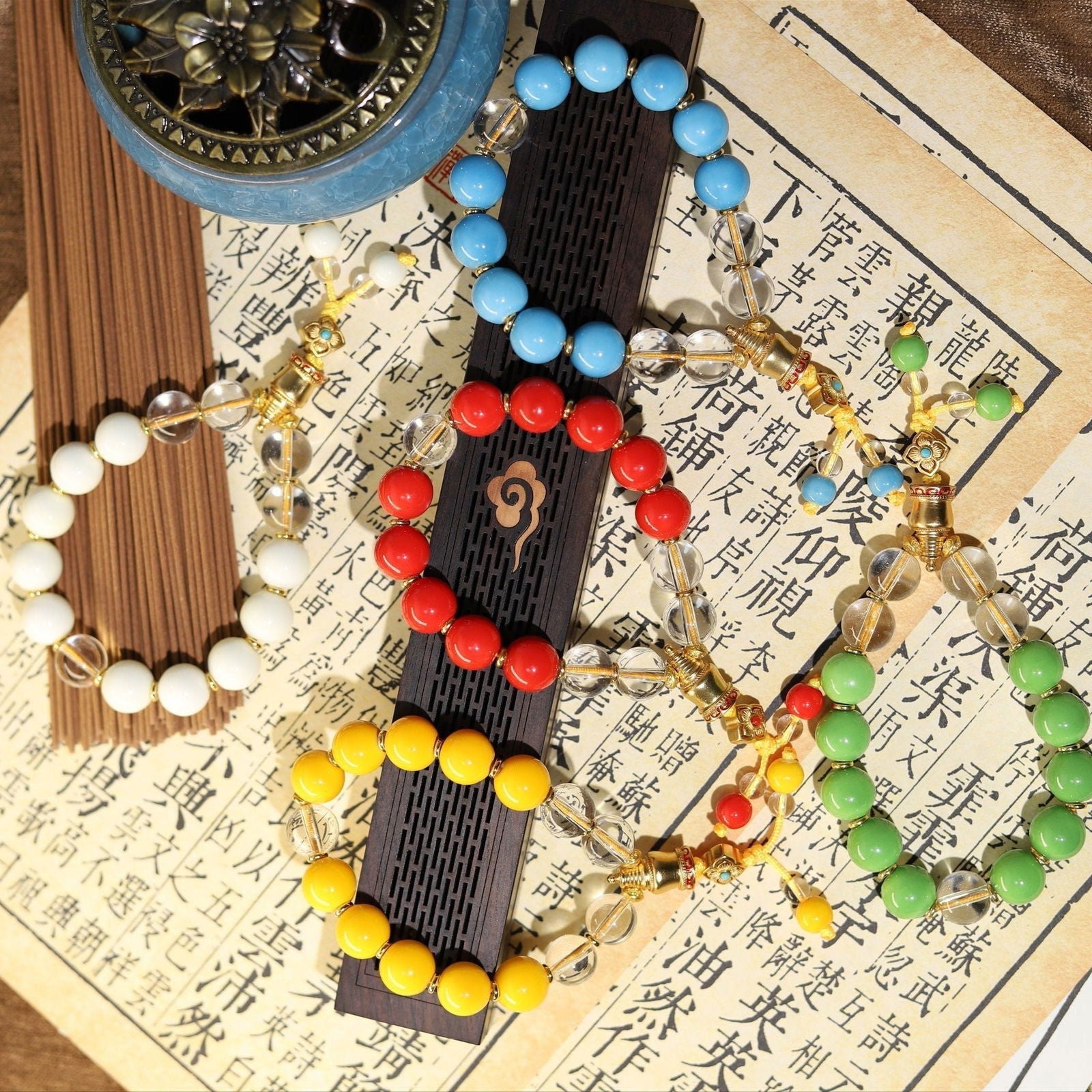 What do the five colors of the bracelet signify? Each color corresponds to a direction of the Wealth Gods in Chinese culture: Red for South, Yellow for Central, Blue for East, Green for North, and White for West, symbolizing holistic prosperity.