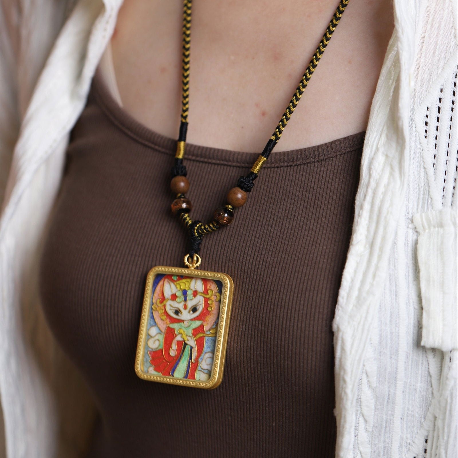 This exclusive Thangka Necklace is handcrafted using traditional Cloisonné technique from high-quality brass, embodying the powerful essence of the Fox Fairy from the Chinese folk religion. Our Thangka necklace has been blessed by real Monks from Mount Wutai, the sacred Buddhist site in China, making it a powerful talisman. The Mystic Love & Prosperity Thangka Pendant infuses your life with good luck, prosperity, and marital bliss. This pendant is more than an accessory. It’s a talisman that brings peace, enhances personal relationships, and supports financial growth.