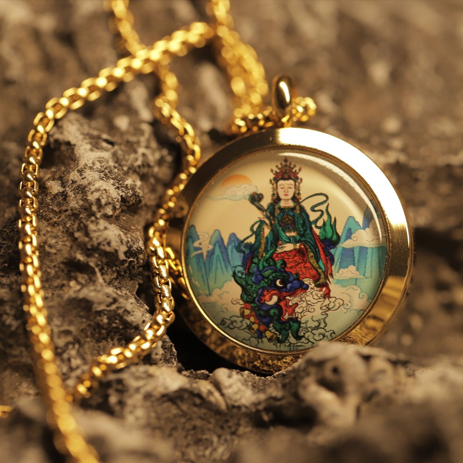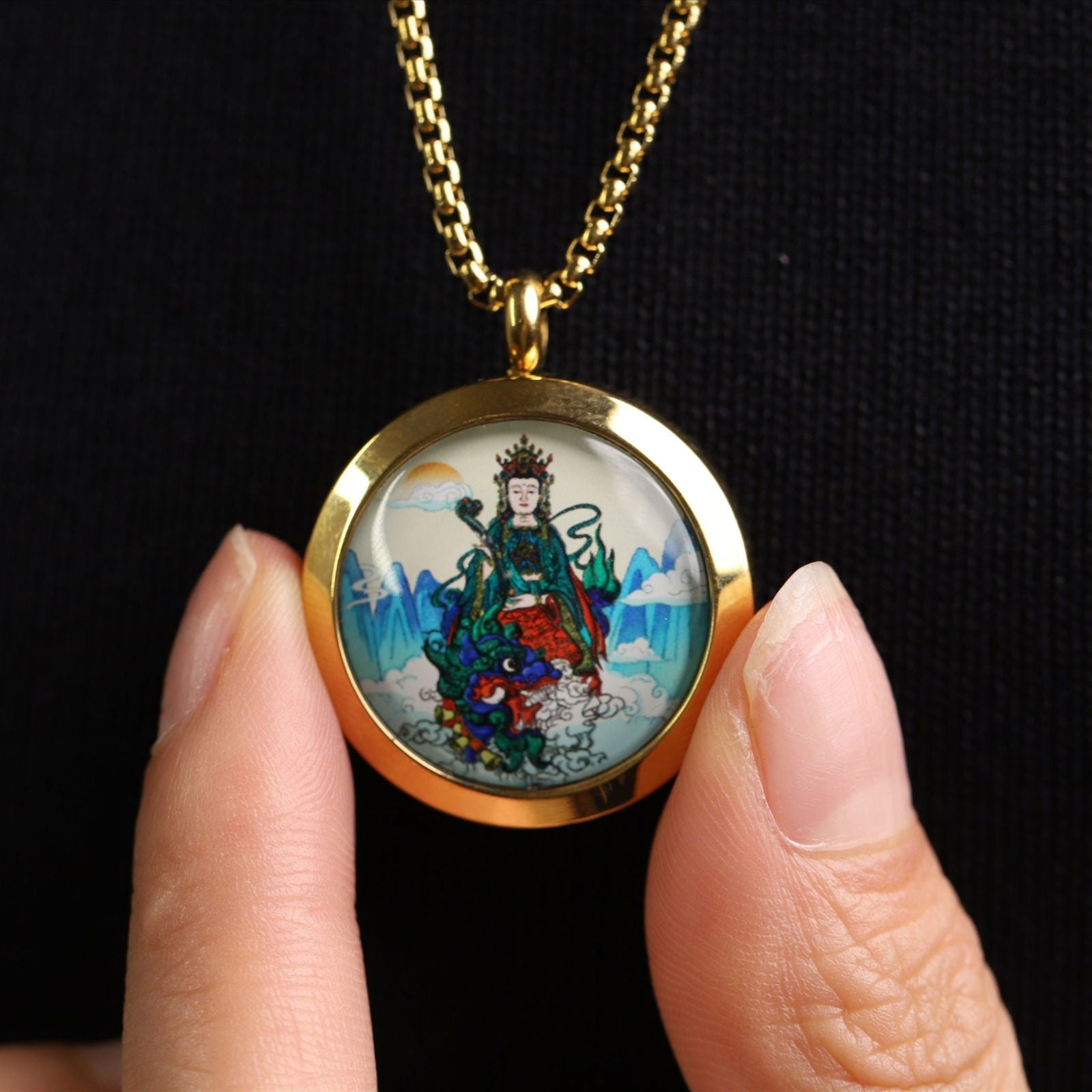 - What is the significance of Manjushri on this pendant? Manjushri represents the enlightened understanding revered in Mahayana Buddhism, known for cutting through delusion.